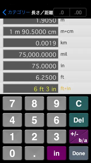 2回のタップで必要な単位換算表にたどりつけま‏す‎。(1) 単位カテゴリーの一覧リストから計算したい単位カテゴリーを選択し‏、‎(2) 変換したい単位の数値表示部をタップするだけ。変換元を "1.0" として、残りの全単位を即座に単位換算しま‏す‎。