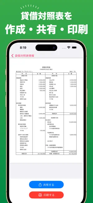 「貸借対照表メーカー」は、貸借対照表のデータの管理や、貸借対照表の作成・共有・印刷が可能なアプリです。情報を入力するだけで自動的に貸借対照表が生成されます。