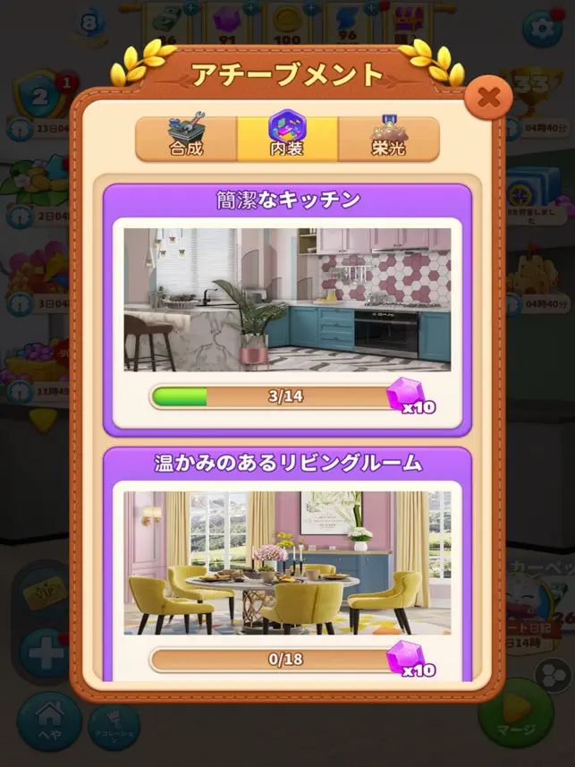 • ポイ活目的 ざっくり流れを言うと、アイテム合成して高Lv品にする→依頼タスクにある品を納品して報奨金を貰う→その報奨金で部屋を3択のデザインから選んでリフォームしていく。