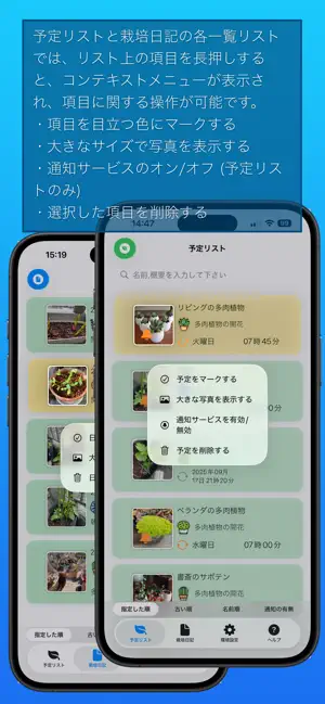 ・水やりなどの予定データと栽培日記を専用の一覧リストで管理します。