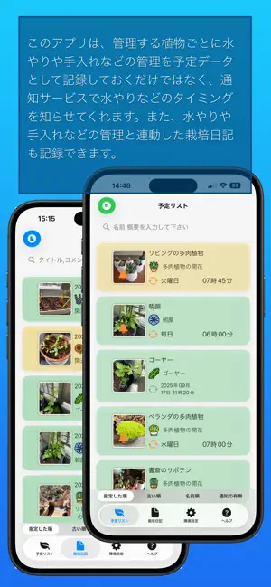 このアプリは、管理する植物ごとに水やりや手入れなどの管理を予定データとして記録しておくだけではなく、通知サービスやウィジェットで水やりなどのタイミングを知らせてくれます。また、水やりや手入れなどの管理と連動した栽培日記も記録できます。