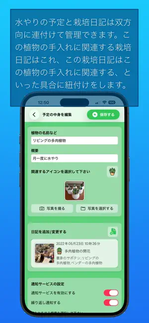 ・植物の水やりや手入れの予定データと関連付けた栽培日記を記録できます。