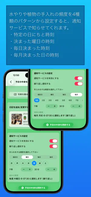 ・植物の水やりや手入れのタイミングを、4種類の頻度のパターンから設定し、通知サービスで知らせることができます。