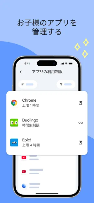• 利用時間の上限を設定する - お子様に適した利用時間を設定しましょう。ファミリー リンクでは、スクールタイムや休息時間のスケジュールによってデバイス利用時間の上限を設定して、お子様がデバイスを使いすぎないよう管理することができます。• お子様のアプリを管理する - アプリの使用に関しては、お子様の必要に応じて柔軟に調整することができます。アプリごとに制限時間を設定できます。教育用アプリやよく使うアプリは時間制限なしに設定できます。アプリをブロックすることもできます。