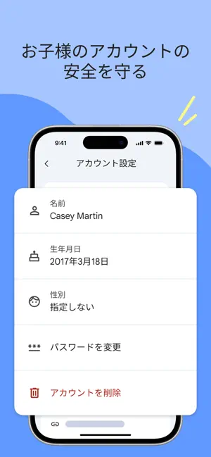 • お子様のアカウントの安全を守る - ファミリー リンクでは、保護者がお子様のアカウントとデータの設定にアクセスして管理できます。保護者は、お子様がパスワードを忘れてしまった場合のパスワードの変更や再設定、お子様の個人情報の編集や、必要であればアカウントごと削除することもできます。*