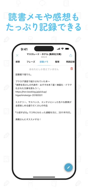 - 読書メモや本の感想、印象に残ったフレーズを自由に記録