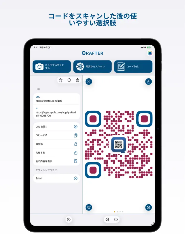 • 履歴: 最もカスタマイズ可能な履歴機能で、以前にスキャンまたは生成されたコードに簡単にアクセスして管理できます。コードをフォルダに整理し、iCloudを使用してデバイス間で同期するか、選択した情報をデバイスにローカルに保存します。履歴は、Face IDのような生体認証でも保護できます。 • 高度な解析: Qrafterは、URL、連絡先情報、イベント、位置データ、メールおよびSMSの送信オプション、Wi-Fi接続詳細などを巧みに解析し、結果をユーザーフレンドリーで意味のある方法で提示します。 • URLセキュリティチェック: ショートリンクの宛先URLを表示し、潜在的な悪意のあるコンテンツを検出するのを助けます。 • パスキーQRコード対応: パスキーをサポートするウェブサイトにQRコードを使用して、より速く、より安全にログインします。 • 自動Wi-Fi接続: Wi-Fiネットワークの資格情報を含むQRコードをスキャンし、手動で入力することなく自動的にネットワークに接続します。 • インベントリースキャナーモード: Qrafterをカスタマイズした在庫管理アプリに変えます。スキャンするたびに、QrafterはバックグラウンドでエンドポイントAPIを呼び出します。エンドポイントAPIのURLも完全にカスタマイズ可能です。 • iPadに最適化: 教育機関やプロフェッショナルな使用に最適な、完全にカスタマイズ可能なiPad用ユーザーインターフェイスを体験してください。一般的な競合アプリはiPhoneバージョンを単に拡大しますが、QrafterのiPadユーザーインターフェイスは、より大きな画面を最大限に活用するように設計されています。また、QrafterはiPadのフルマルチタスキングもサポートしています。 • VoiceOver カスタマイズ: Qrafterは完全にアクセス可能で、すべてのユーザーにシームレスな体験を提供することにコミットしています。その VoiceOver カスタマイズにより、視覚障害のあるユーザーも簡単にナビゲート、スキャン、コード生成が可能です。 エンドユーザーライセンス契約:https://www.apple.com/legal/internet-services/itunes/dev/stdeula/