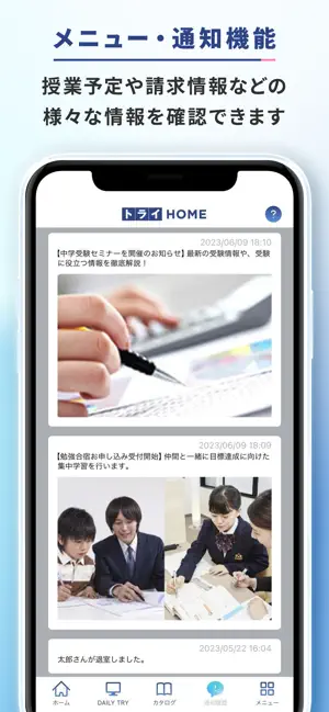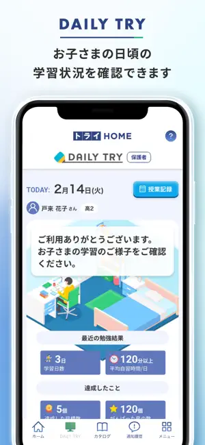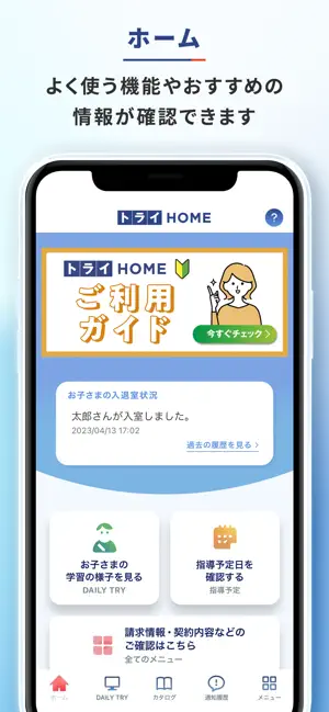 ③ ホーム画面の「DAILY TRY」や「指導予定」、メニュー画面の「請求確認」や「契約内容」などタップして、お子さまのお名前や正しい情報が反映されているかご確認ください。