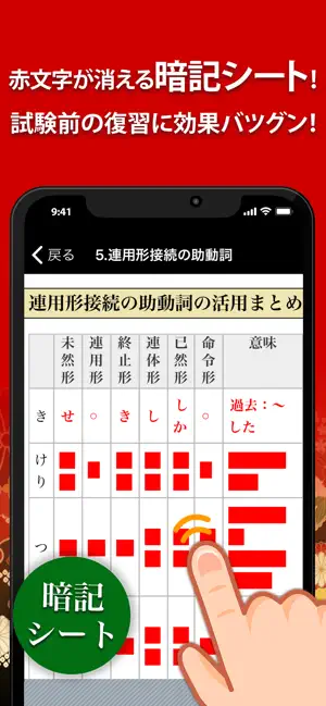 暗記用に赤字を伏せて学べる機能が付いた、単語や活用表・句法のまとめページもおすすめ!試験前の復習に活用しよう!