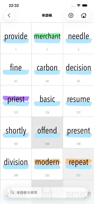 ・単語を確認する毎にタイルが黒くなっていく「使い込み度」表示