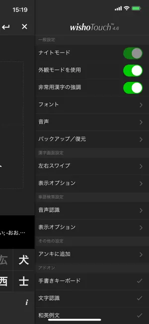 他アプリからシェアシートで検索 ナイトモード(夜間モード) Apple Watchアプリ ホーム画面ウィジェット ロック画面ウィジェット このアプリはJMDICTとKANJIDIC2とRADKFILEのファイルを使用しています。これらはMonash UniversityのElectronic Dictionary Research and Development Groupの著作物であり著作権者の許諾の上使用されています。 KanjiVGは©Ulrich Apel、クリエイティブコモンズ Attribution Share-Alike (表示-継承) ライセンスに基づき使用されています。