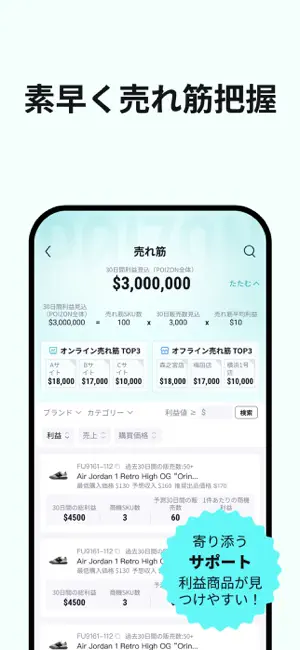 Nike、Air Jordan、Adidas、Asics、Issey Miyakeといった商品を出品して、売上を手にしよう。