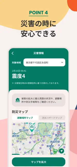 災害時に、地域の災害情報や避難場所、避難道具をご案内します。日頃の防災対策等に役立てることもできます。