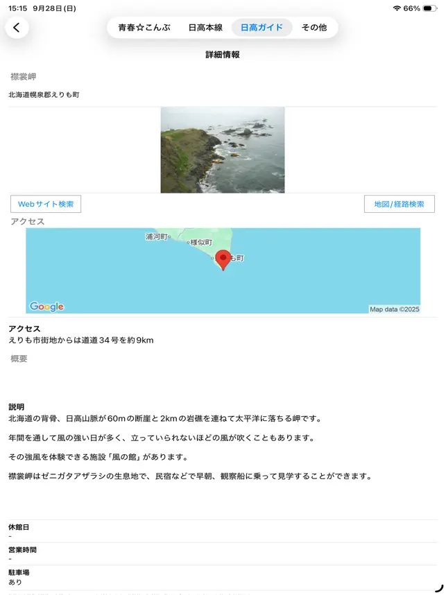 3. JR北海道・日高本線の停車駅沿線を含む、現地取材による観光スポットを中心とする、えりも町を含む日高地方と日高本線の始発駅・苫小牧市の観光スポット検索。