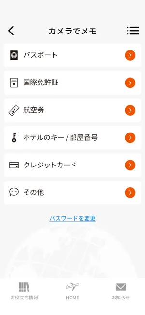 旅行中、パスポートなどの大事な情報を撮影してパスワード付きで記録できる「カメラでメモ」機能など、便利なコンテンツをご用意しています。ぜひご利用ください。