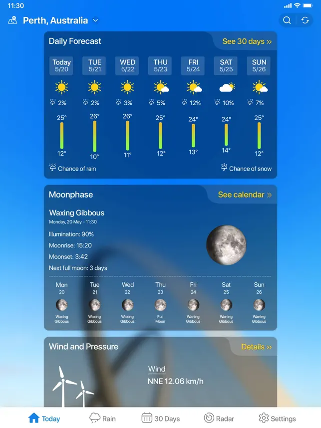 天気予報では現在地の天気を自動的に検出します。天気予報には、気象条件、気圧、相対湿度、視界距離、異なる単位の降水量、露点、風速と方向、10日間の将来予測、毎時の天気予報などの多くの情報があります。