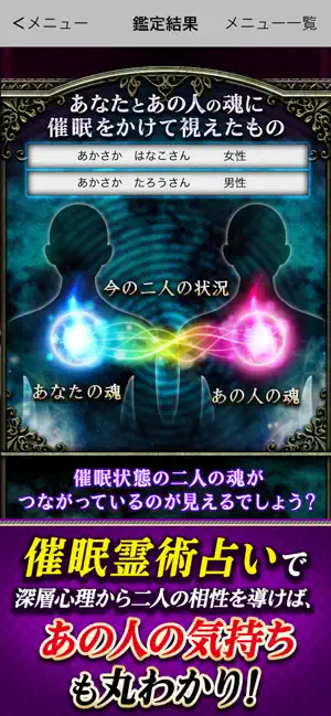 このアプリだけの限定占いも多数! お得なパックの占いも! 気になるあの人との相性が気になったら! 相性占いの決定版を今すぐ体感してください!