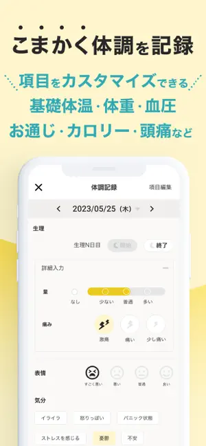 生理がないときは生理日予測をオフに。体重管理、避妊、血圧、ダイエット、食事カロリー、頭痛など症状の体調管理や予定管理を1つのカレンダーで。ピル服用後や更年期障害など不安を感じたらオンライン医療相談も。