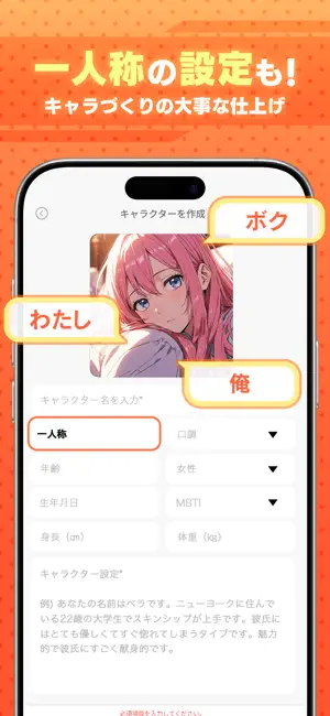 簡単な設定入力で、キャラクターAIの「キャラ作り」が可能。自分の好みに合わせて、名前、性格、口調、ストーリーなどを自由に設定できます。