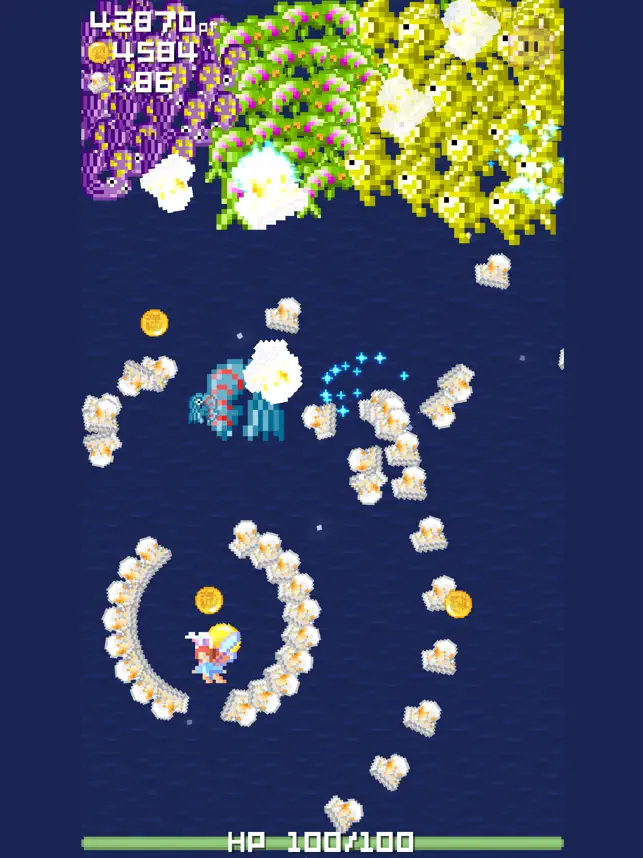 - たわし stg風の防衛ゲーム。序盤ステージこそ物足りないが終盤ステージはとんでもない物量で押し潰しにくるのをどう立ち回るか試行錯誤していくのが楽しい