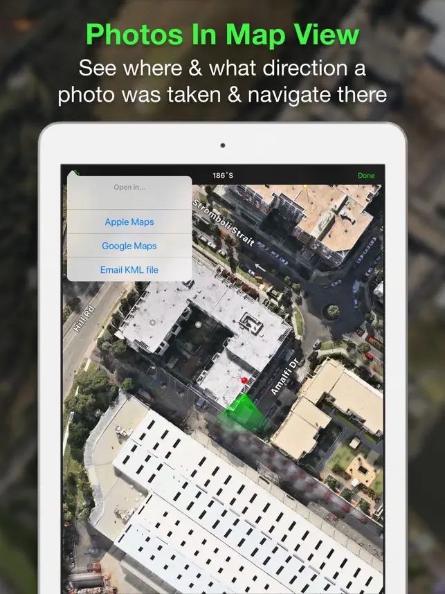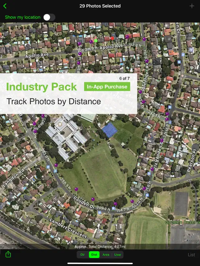 View photos by direction, the distance between photos, area of photos taken and distance to your added markers via imported KML files or dropped pins.