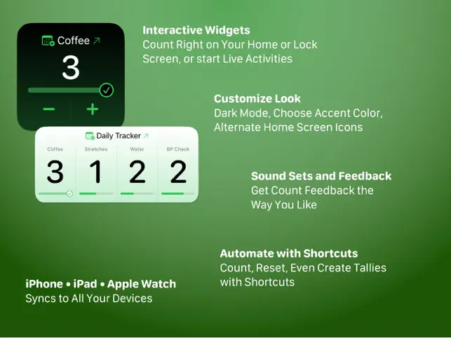 Tally is the quick, easy way to keep track of any counts, from habit tracking to game scorekeeping. Tally’s gesture-based interface keeps your eyes free while counting.
