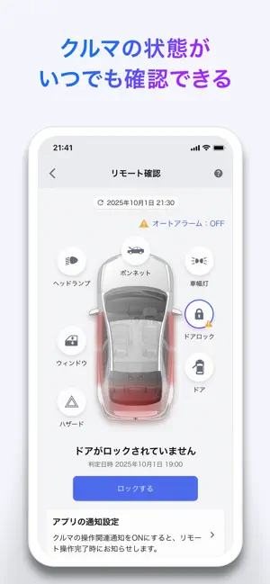 ・クルマの状態をいつでも確認。鍵の閉め忘れをスマホに通知して、その場でロック。
