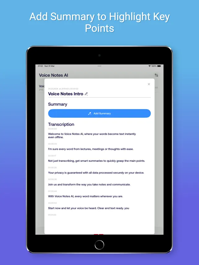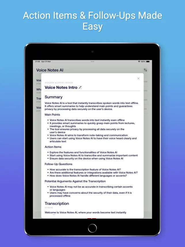 High-Precision Transcription: Powered by a local AI model, Voice Notes AI transcribes speech to text in real-time, ensuring quick and private transcription directly on your device. Seamless Offline Functionality: Don’t let connectivity issues interrupt your flow. Record and transcribe notes anywhere, anytime, with full offline support. Privacy-Centric: With all processing done on your device, your conversations stay private. Future updates will introduce optional iCloud syncing for enhanced accessibility. Intelligent Summaries: Automatically generate concise summaries of your transcriptions, capturing essential points, action items, and follow-up questions, making review and organization effortless. Background Transcription Support: Keep capturing words for up to two hours, even when the app is in the background. Ideal for meetings and school sessions, ensuring you never miss a word.