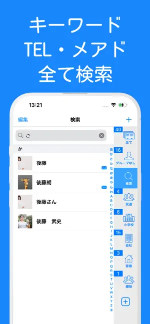 人気No.1の電話帳アプリ、ドラッグ&ドロップで簡単にグループ分け、グループ単位で一斉メールを送信できます。