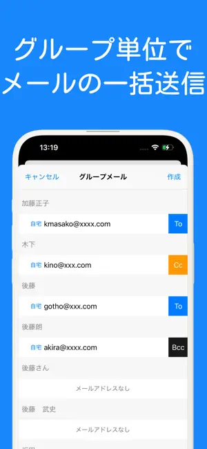 - 一斉送信に対応:グループ単位でメール・MMSを一度に送信可能