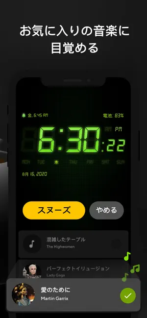 アラームクロックはあなたのiPhone を多色なテーマで楽しめる美しいデジタル時計とお気に入りの音楽を鳴らせる目覚まし時計に変身させます。暗闇で明るくし-たい時に重宝する懐中電灯もビルトイン!