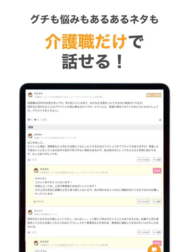 - 介護職のベテランも初心者も使いやすい! 質問することも、みんなの投稿を読むこともシンプルに手軽に出来るなと感じました。