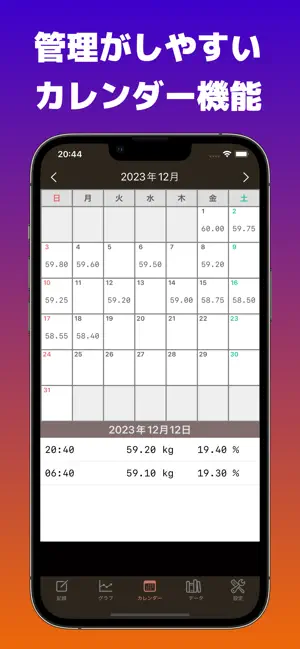 シンプルでありながら、体脂肪の記録やBMI値の算出、グラフ表示、目標体重設定など基本機能をしっかりと備えた多機能なアプリとなっております。