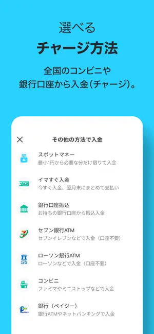 さらに、銀行口座やコンビニからの入金はもちろん、今すぐに入金したい場合は「スポットマネー」や「イマすぐ入金」など、チャージ手段も豊富。