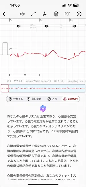 GPT は Apple Watch の心電図をわかりやすい言葉で説明し、心拍リズムのパターンを確認できるようにします。たとえば、心房細動が特定の時間に起きている場合や、HRV の変化を確認できます。