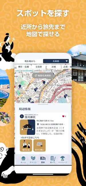 - 近所から旅先までさまざまな神話・伝説スポットを地図上から探せます。