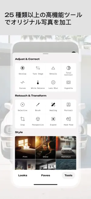 • シミ除去、ブラシ、ストラクチャ、HDR、射影変換などの 25 種類以上のツールとフィルタ(下記のリストを参照)