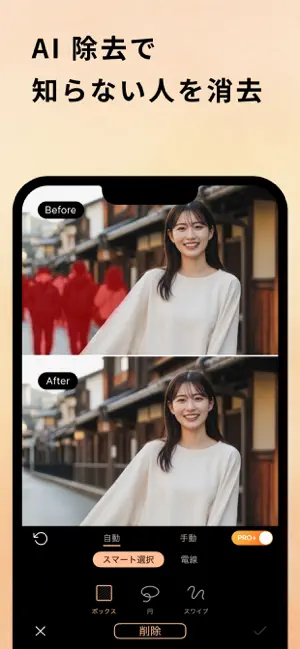 ・オブジェクト除去: 不要な要素をタップするだけで素早く削除。すっきりとした写真に仕上げます。
