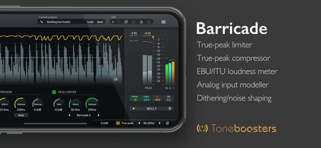 ToneBoosters Barricade is a studio-quality, professional, true-peak limiter and peak compressor AUv3 plug-in with a gorgeous interface and integrated ITU / EBU compliant loudness measurement.