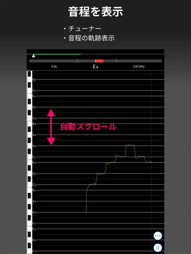 音の高さ・音程を軌跡で確認できるチューナーで‏す‎。
