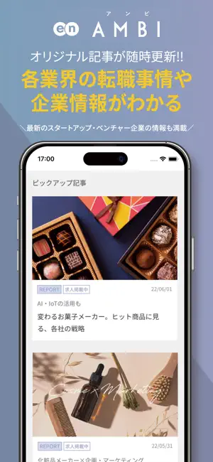 また、積極採用中の企業特集や大手企業へのインタビュー記事など、AMBIオリジナル記事も掲載中。手軽に情報収集を行いながら、転職活動を進めることができるサービスです。