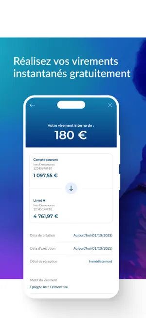 • Consultez et gérez vos comptes et contrats (comptes bancaires, comptes épargne, crédits immobiliers, crédits personnels et contrats d'assurance), • Réalisez vos virements instantanés gratuitement, • Gérez votre carte bancaire, • Contactez votre banque.