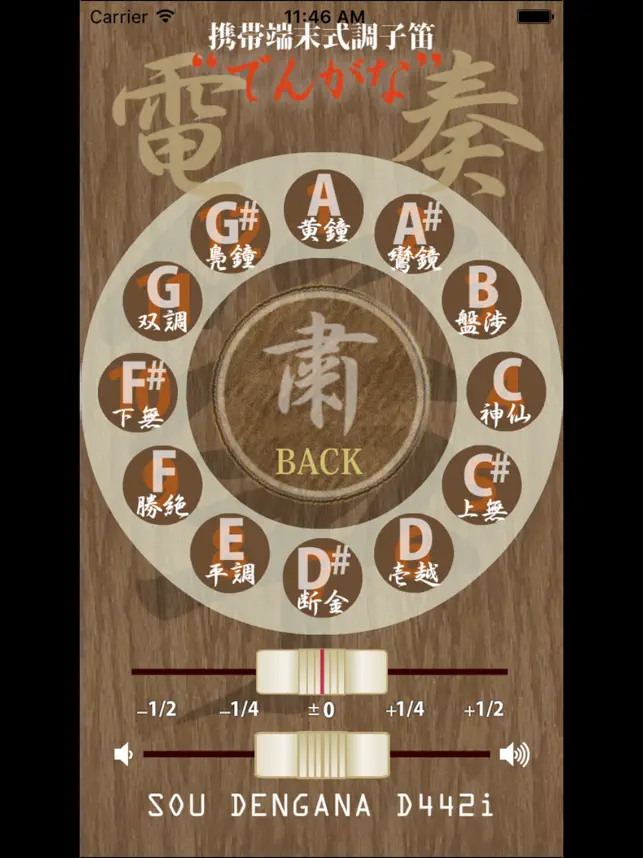 邦楽器用電子調子笛 電奏“でんがな”のiOS。三味線用440Hzと筝用442Hzでご利用頂けます。各音階において上下に1/8音ずつの微調整が可能。Airアプリケーションです。