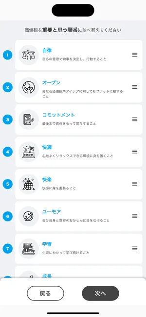 アプリでは、価値観選択結果のログやスクショが保存可能になっています。ぜひ今後の振り返りなどのためにお手元に結果をとっておいてください。