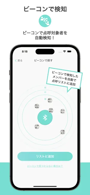 同じアプリを利用している近くのスタッフをビーコンで検知、そのまま点呼打刻できます。