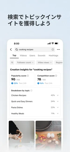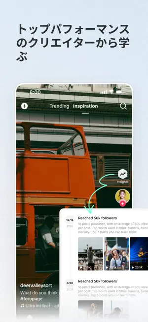 TikTokがお届けする高度なツールと使いやすい機能であなたのクリエイティビティを存分に発揮し、多くの人に注目されるコンテンツを作りましょう。新たな機会の発掘、予測分析などが可能なTikTok Studioを使えば、情報に基づいた戦略的なアプローチでコンテンツを作ることができ、たくさんの視聴者に作品を届けて、自分のポテンシャルをフルに発揮できます。