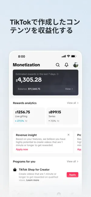 ○ 収益化:TikTok Studioが提供する各クリエイターに合わせたおすすめの収益化方法と高度な分析を活用して、TikTokでの作品からさらに報酬を得る機会を見つけられます。収益額を詳しく分析して、報酬獲得のパフォーマンスを簡単に最大化できます。