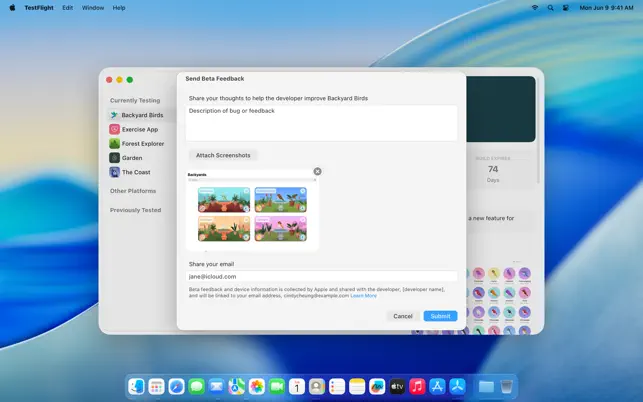 インストール、テスト、およびフィードバックの送信の手順、およびデータの処理方法の詳細については、testflight.apple.com を参照してください。