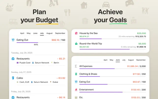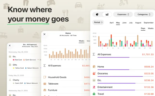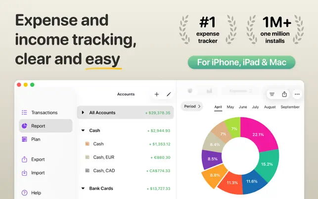 Features: • Quick and easy adding of transactions. • Customizable accounts and categories—you can select icons and colors. • Synchronization between devices. • Flexible budget settings. • Recurring transactions. • Built-in calculator and currency converter. • Automatic backup. • Multiple currencies: over 170 currencies and exchange rates.