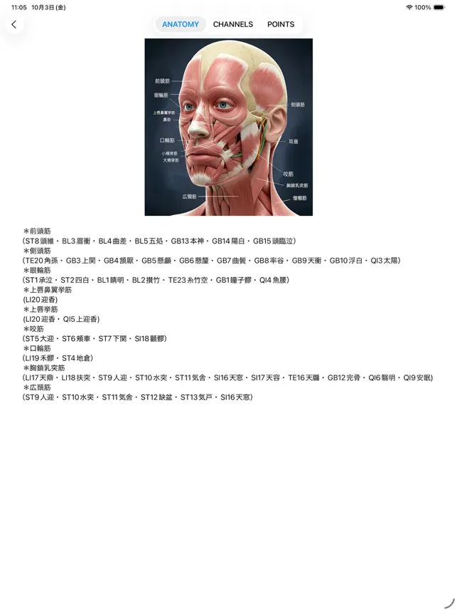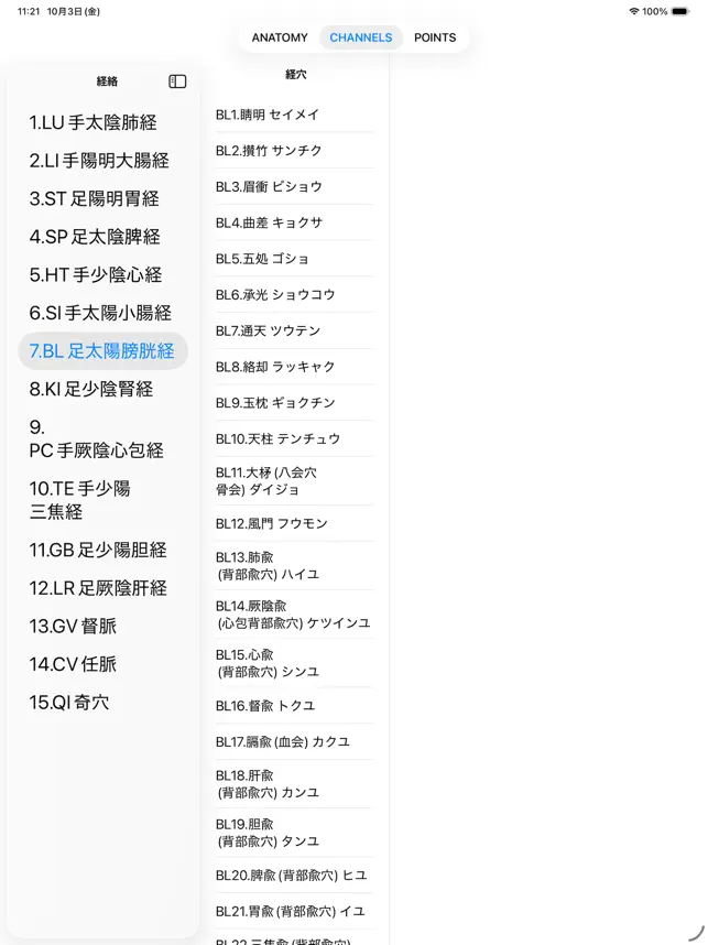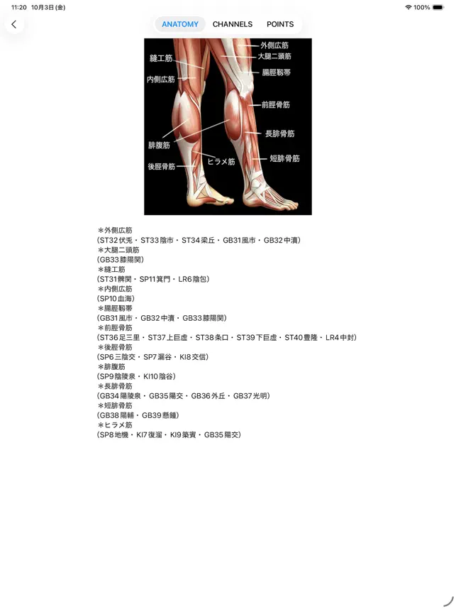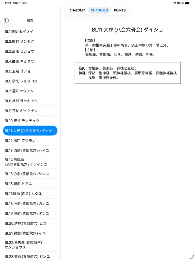 WHO標準経絡に基ずいた、経穴ア‏プリ‎。各経穴(361穴)の位置、主治、筋肉、神経、血管が表示、